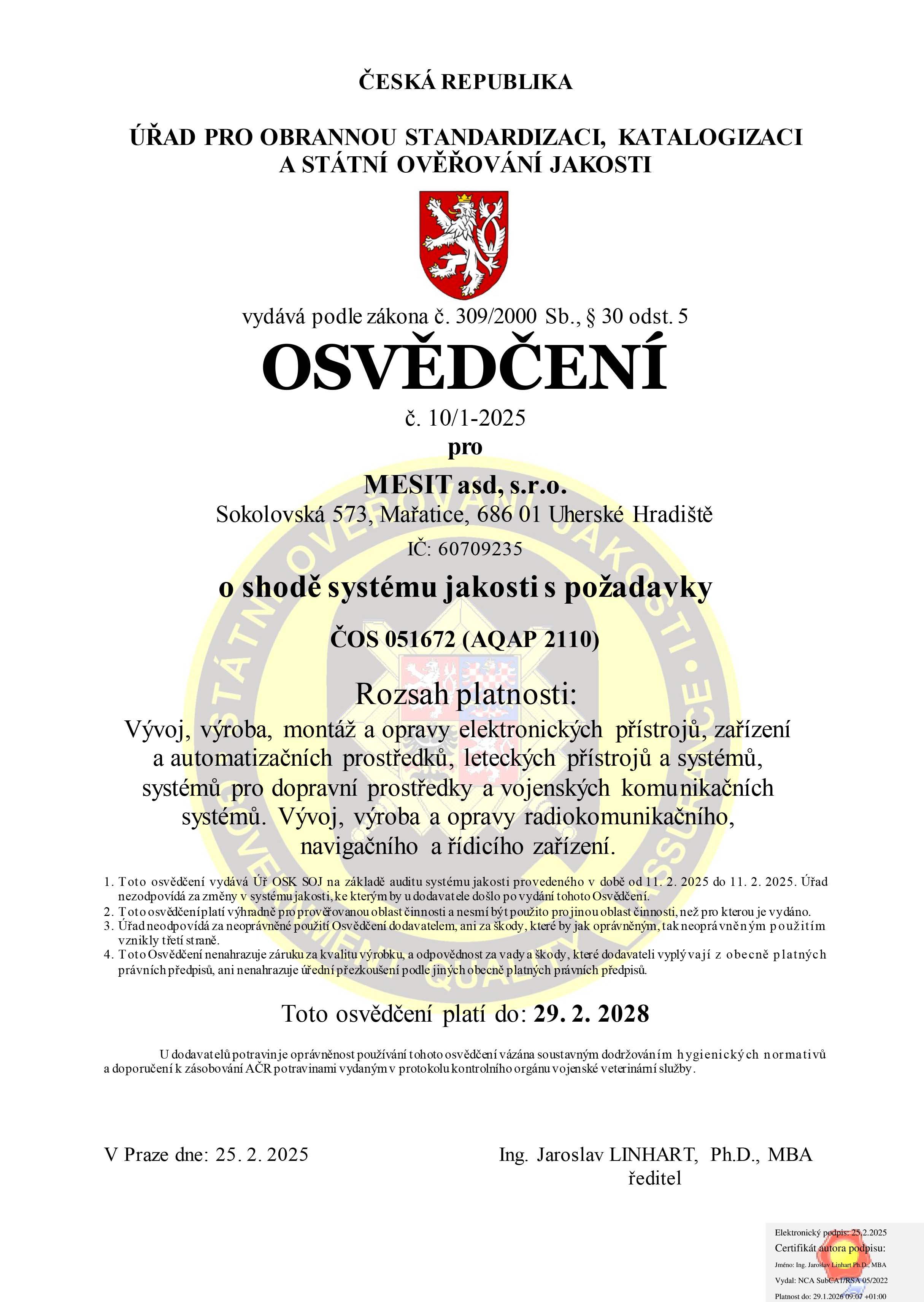 - Osvědčení o shodě systému jakosti s požadavky předpisu AQAP 2110 (ČOS 051672) od Úřadu pro obrannou standardizaci, katalogizaci a státní ověřování jakosti