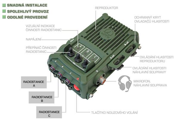 RM1 excels with its rugged and robust design. The controls are protected with protective covers for the prevention of accidental incorrect switching or damage of the controls. Installation is easy in any military vehicle. When developing this device, MESIT asd, s.r.o. utilized their long-term experience from the development of vehicle intercoms and radios.